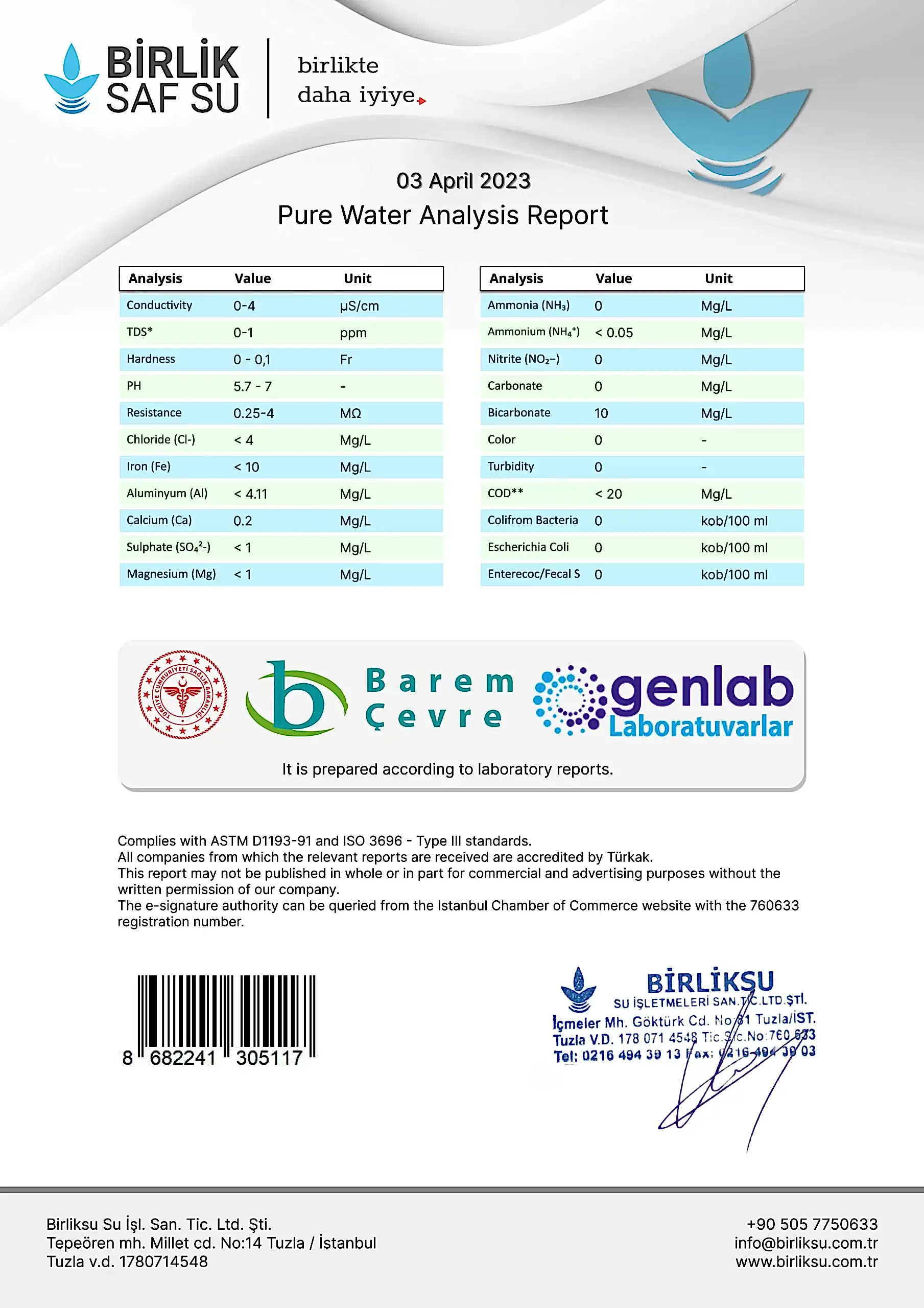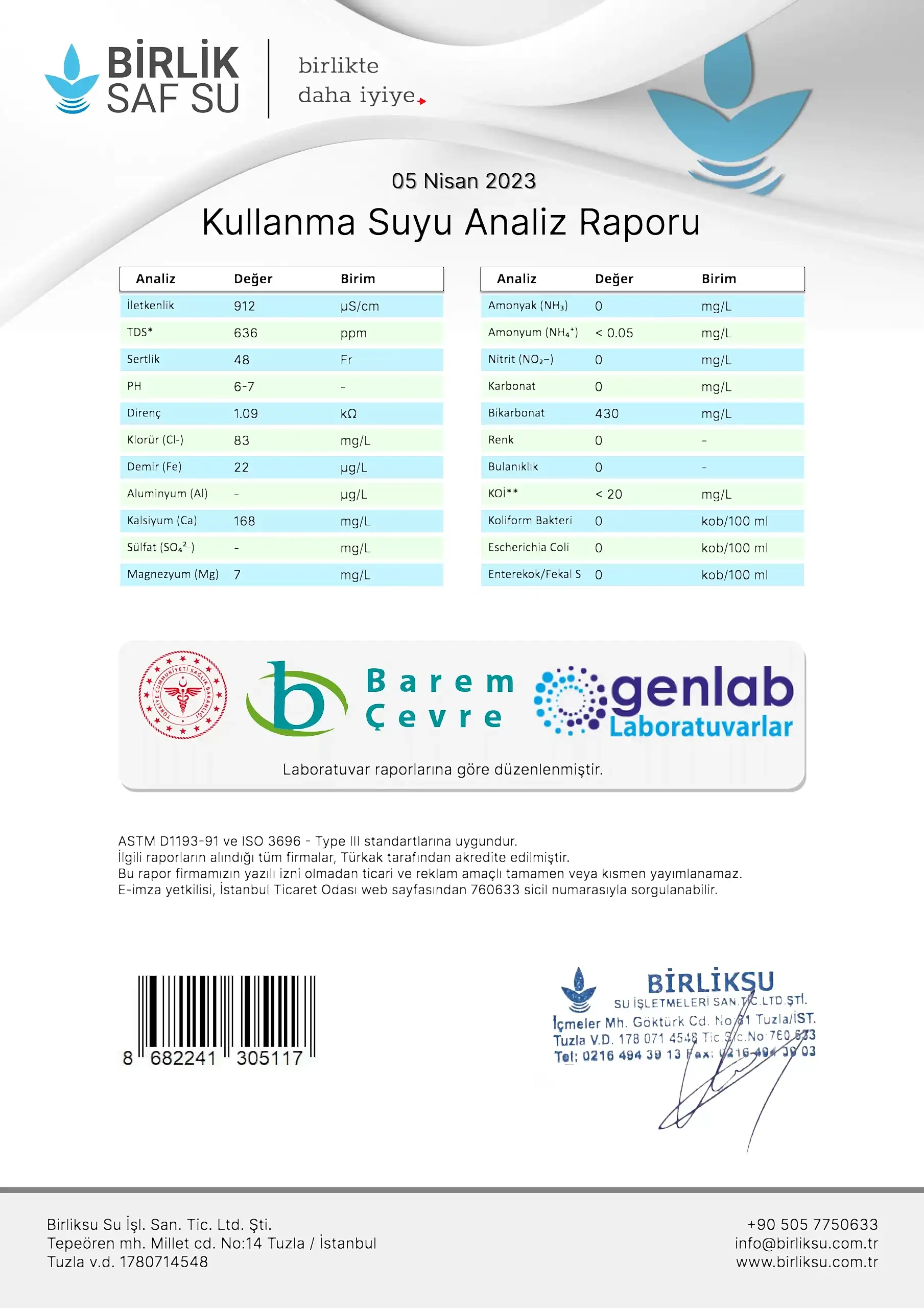 Saf Su Analiz Belgesi