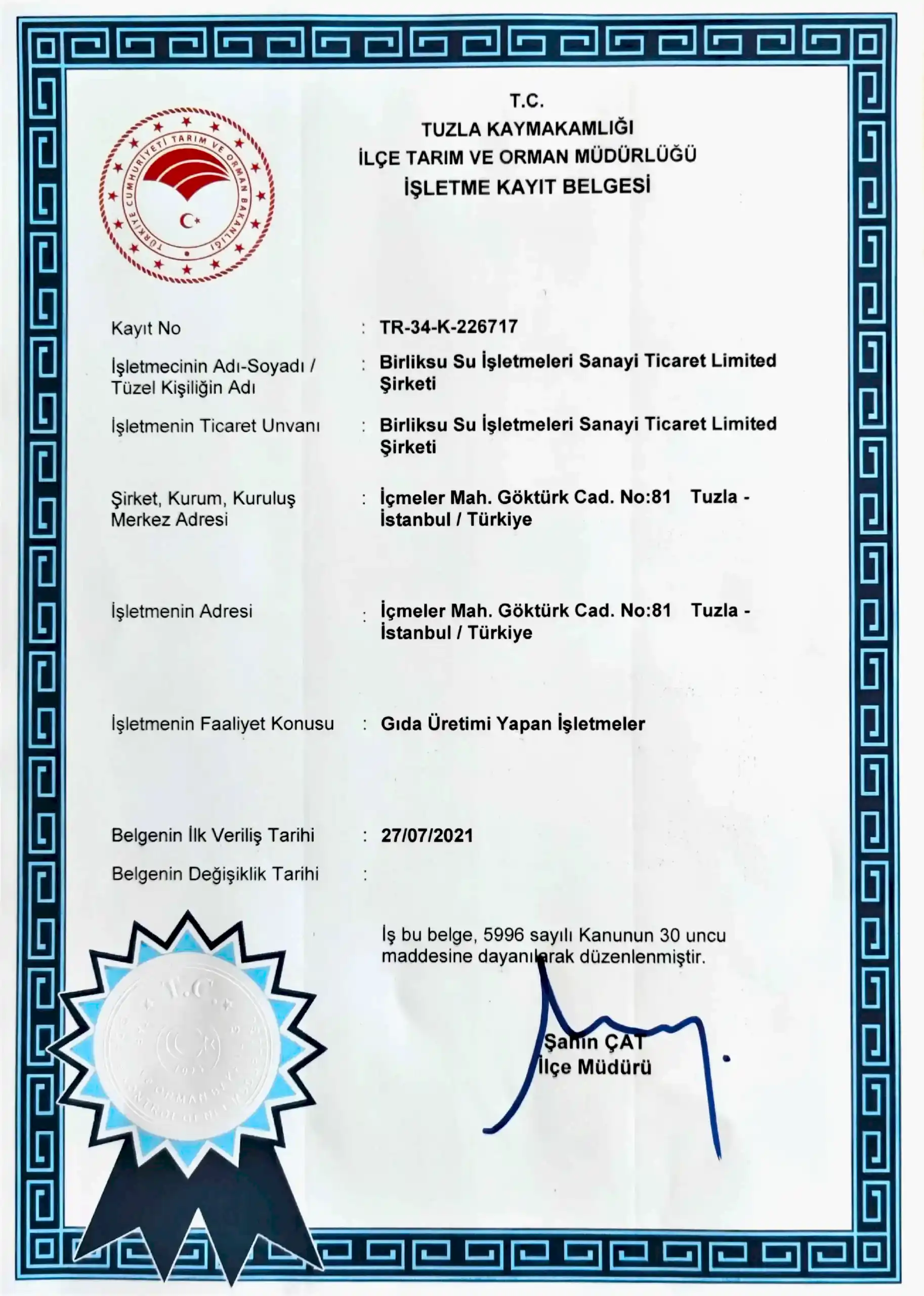 Gıda İşletme Kayıt Belgesi